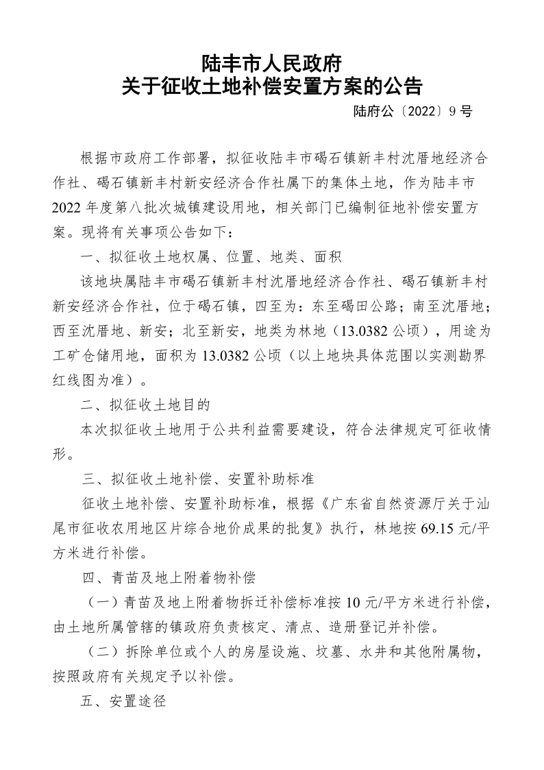苹果直播 关于征收土地补偿安置方案的公告(陆府公〔2022〕9 号)
