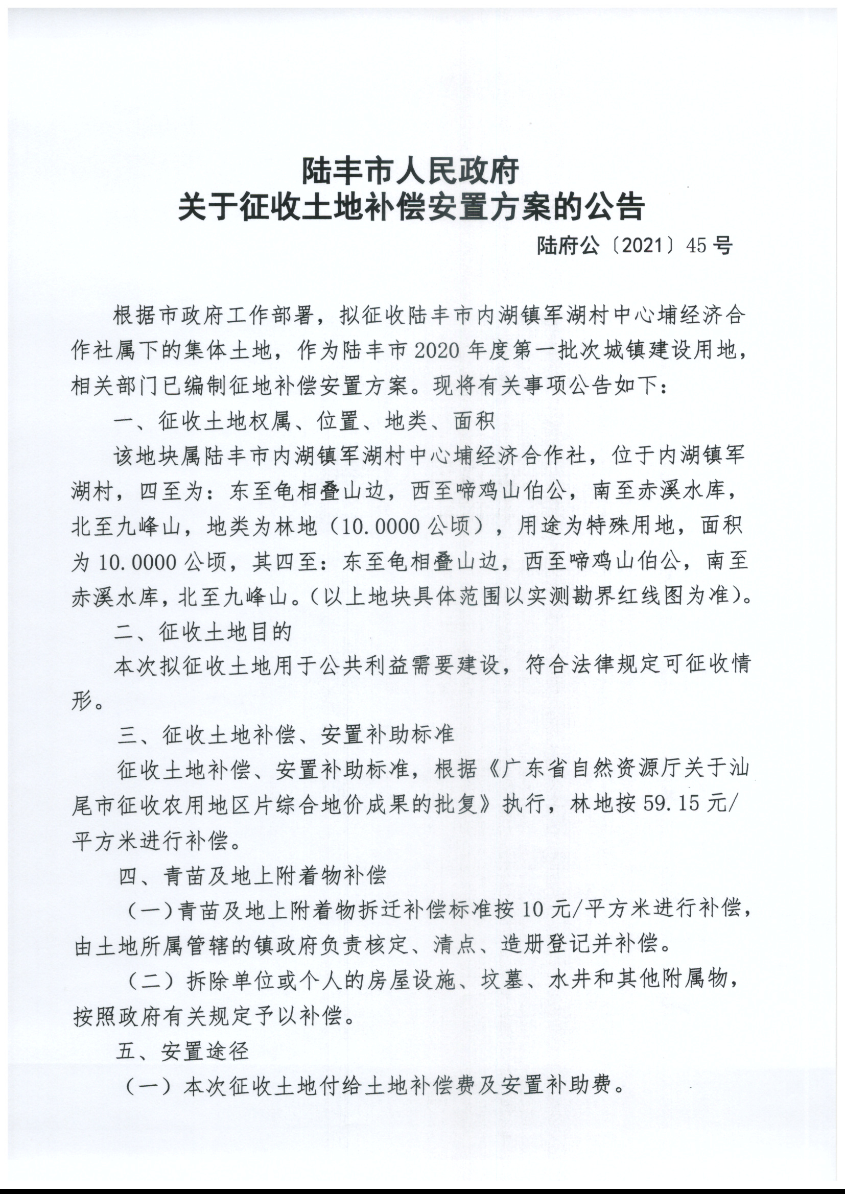 苹果直播 关于征收土地补偿安置方案的公告(陆府公〔2021〕45号)