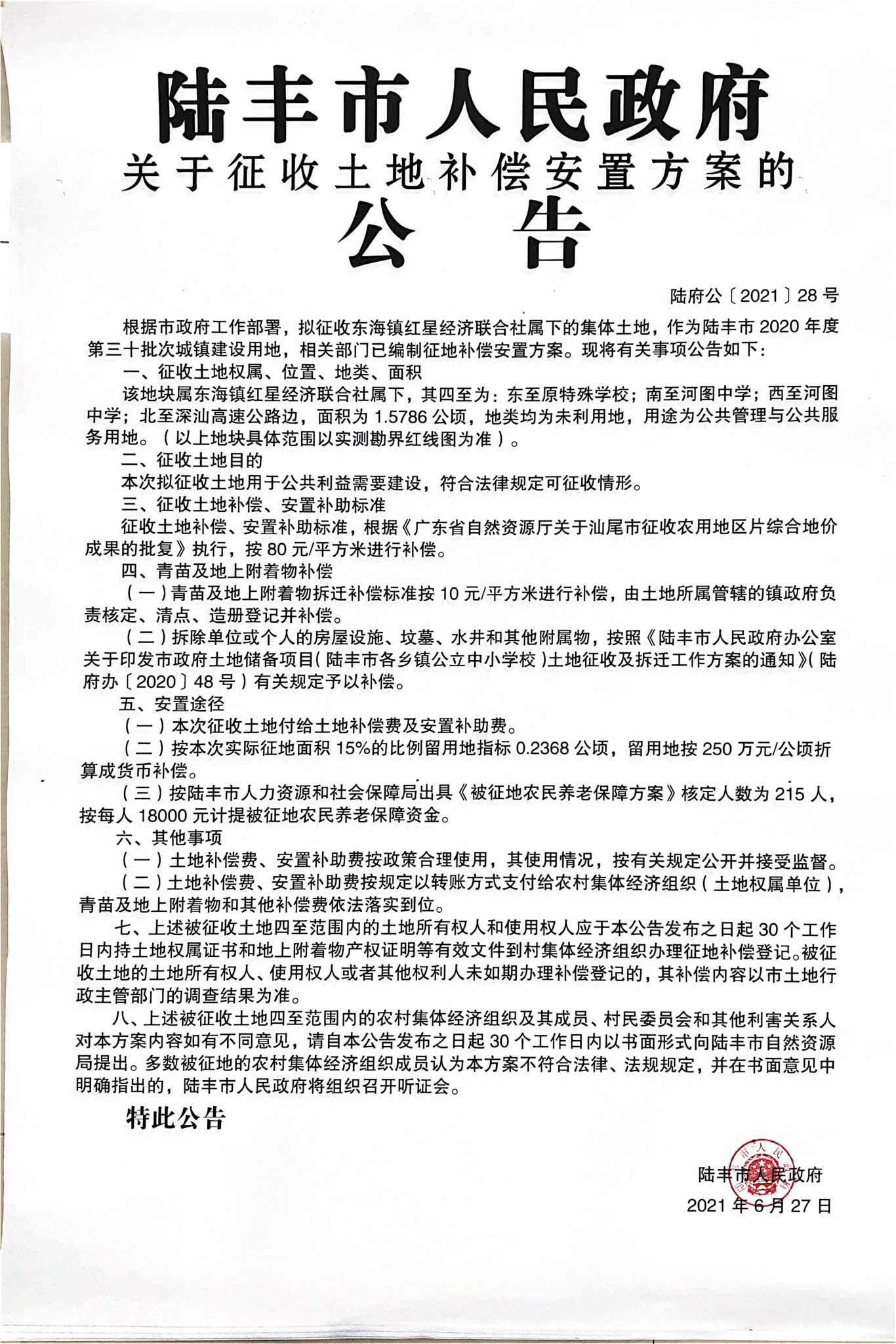 苹果直播 关于征收土地补偿安置方案的公告(陆府公[2021]28号)