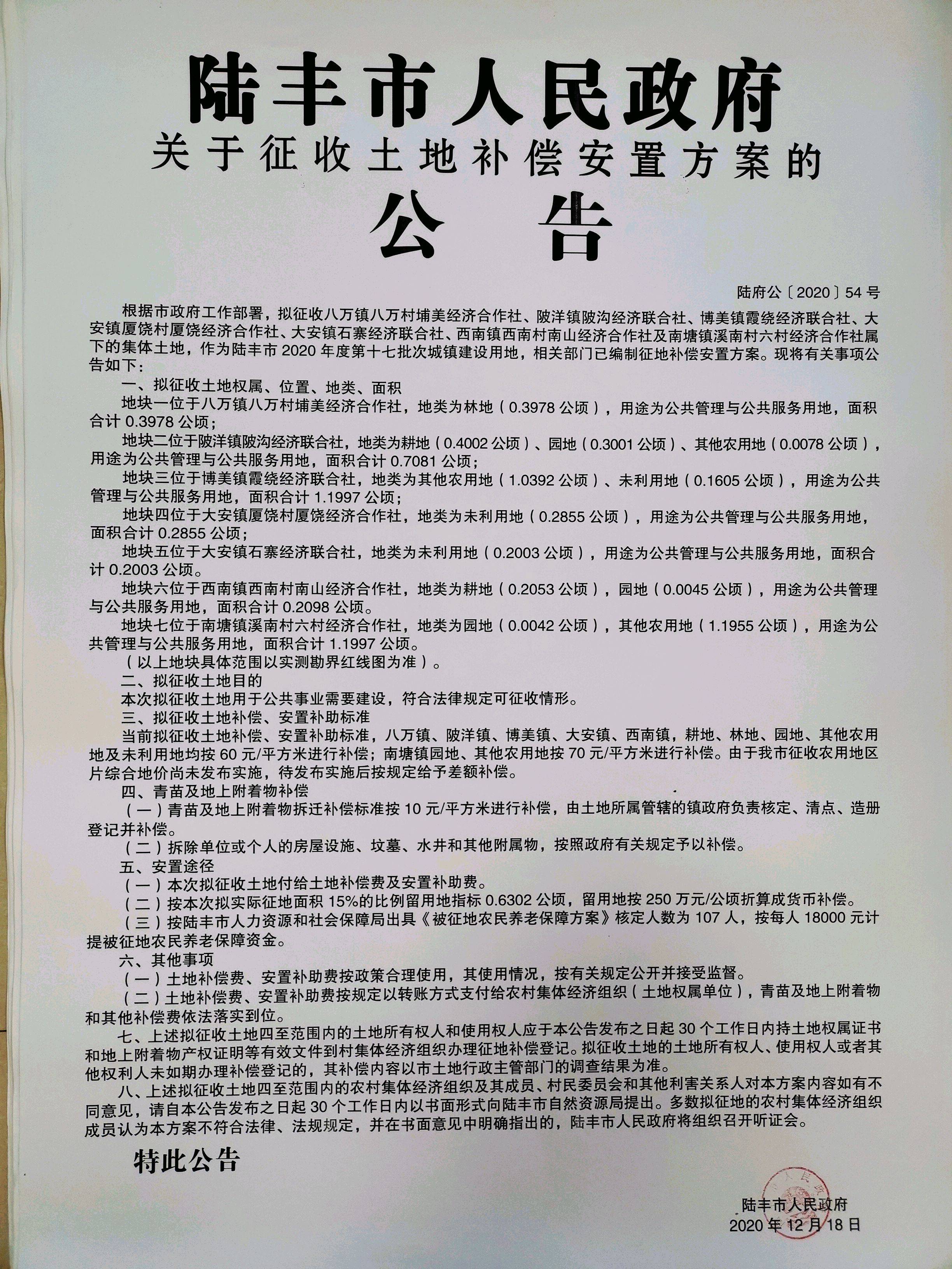 苹果直播 关于征收土地补偿安置方案的公告(陆府公[2020]54号)