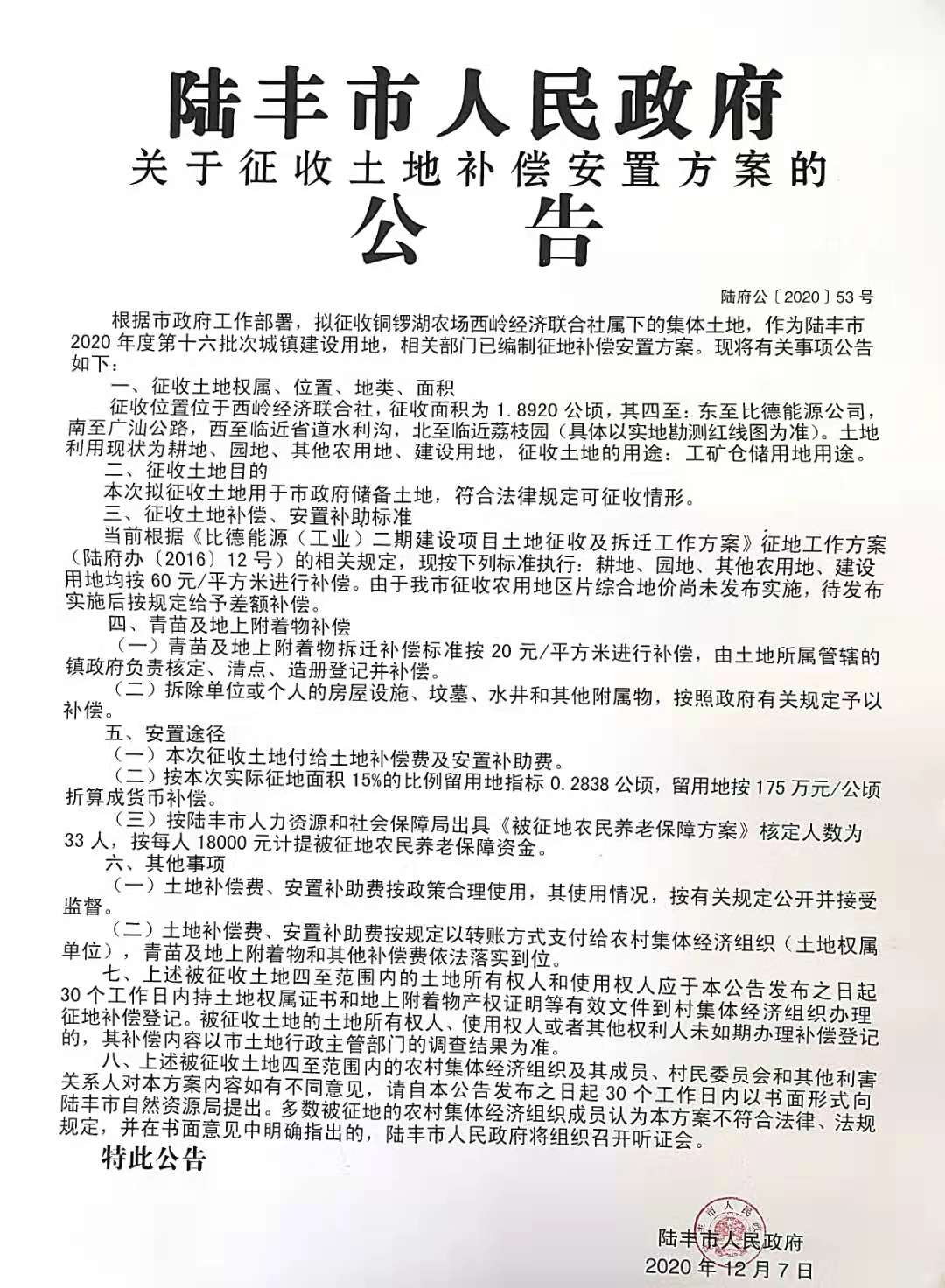 苹果直播 关于征收土地补偿安置方案的公告(陆府公[2020]53号)