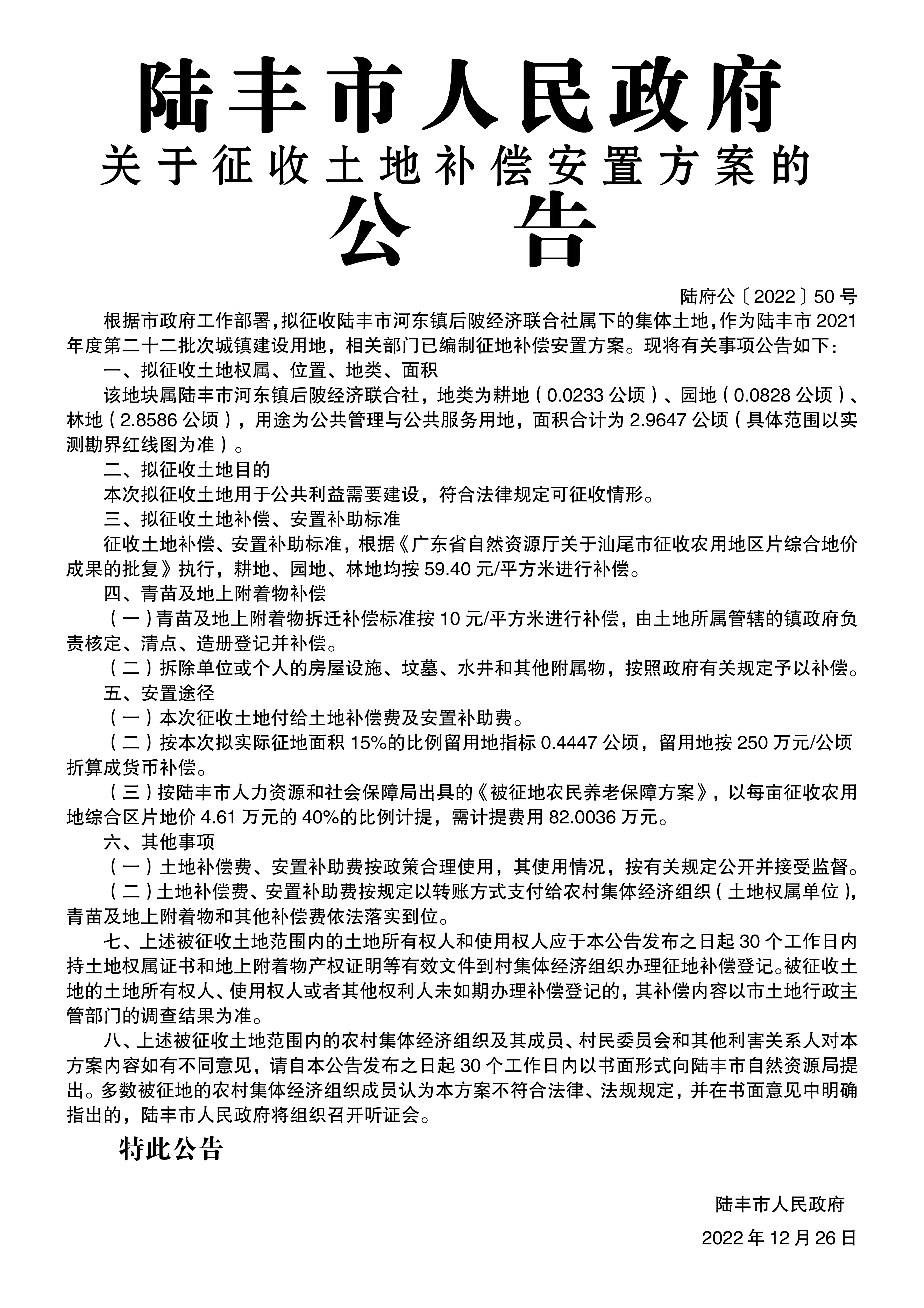 苹果直播 关于征收土地补偿安置方案的公告(陆府公[2022]50号)