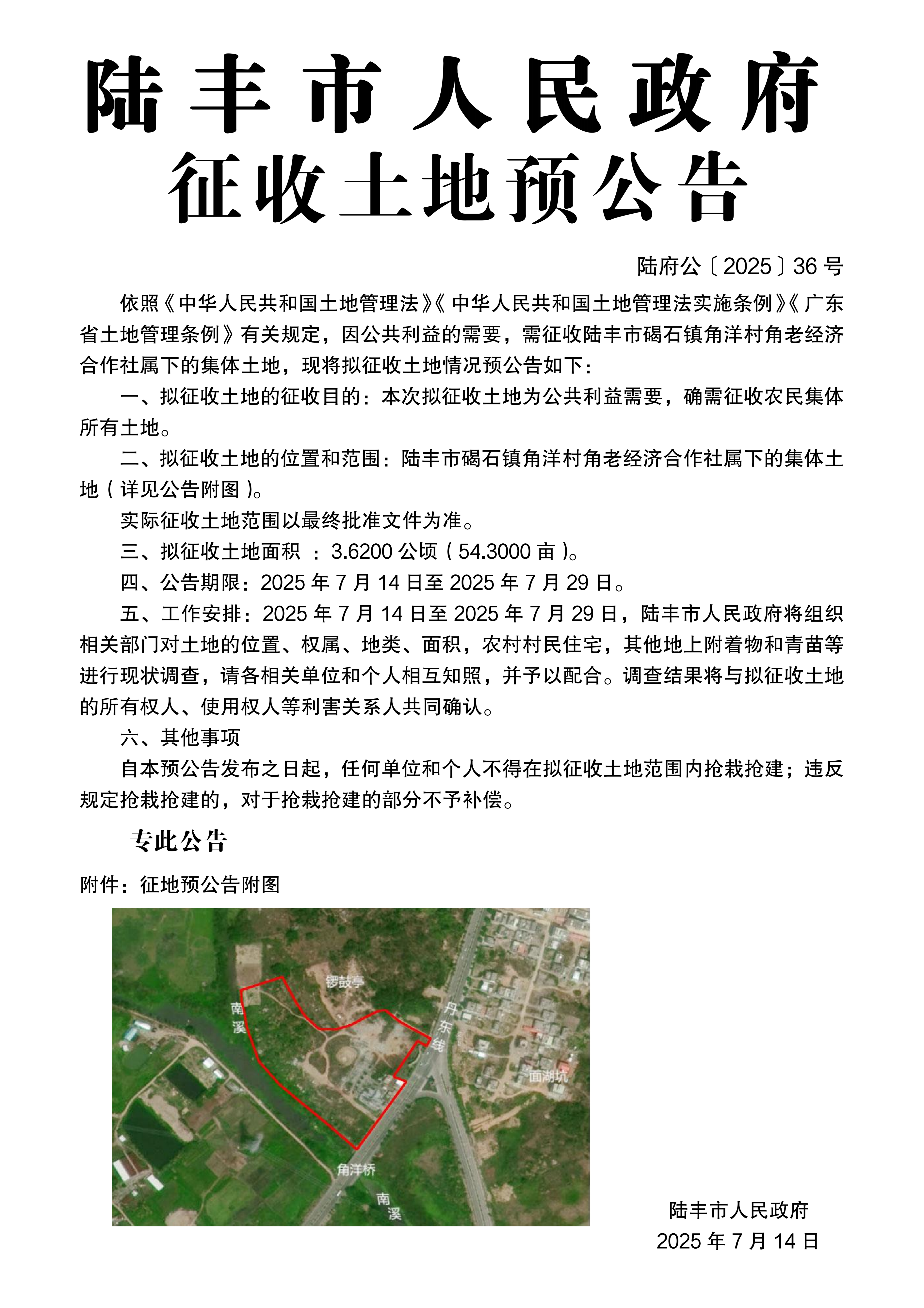 苹果直播 关于征收土地预公告(陆府公〔2025〕36号)