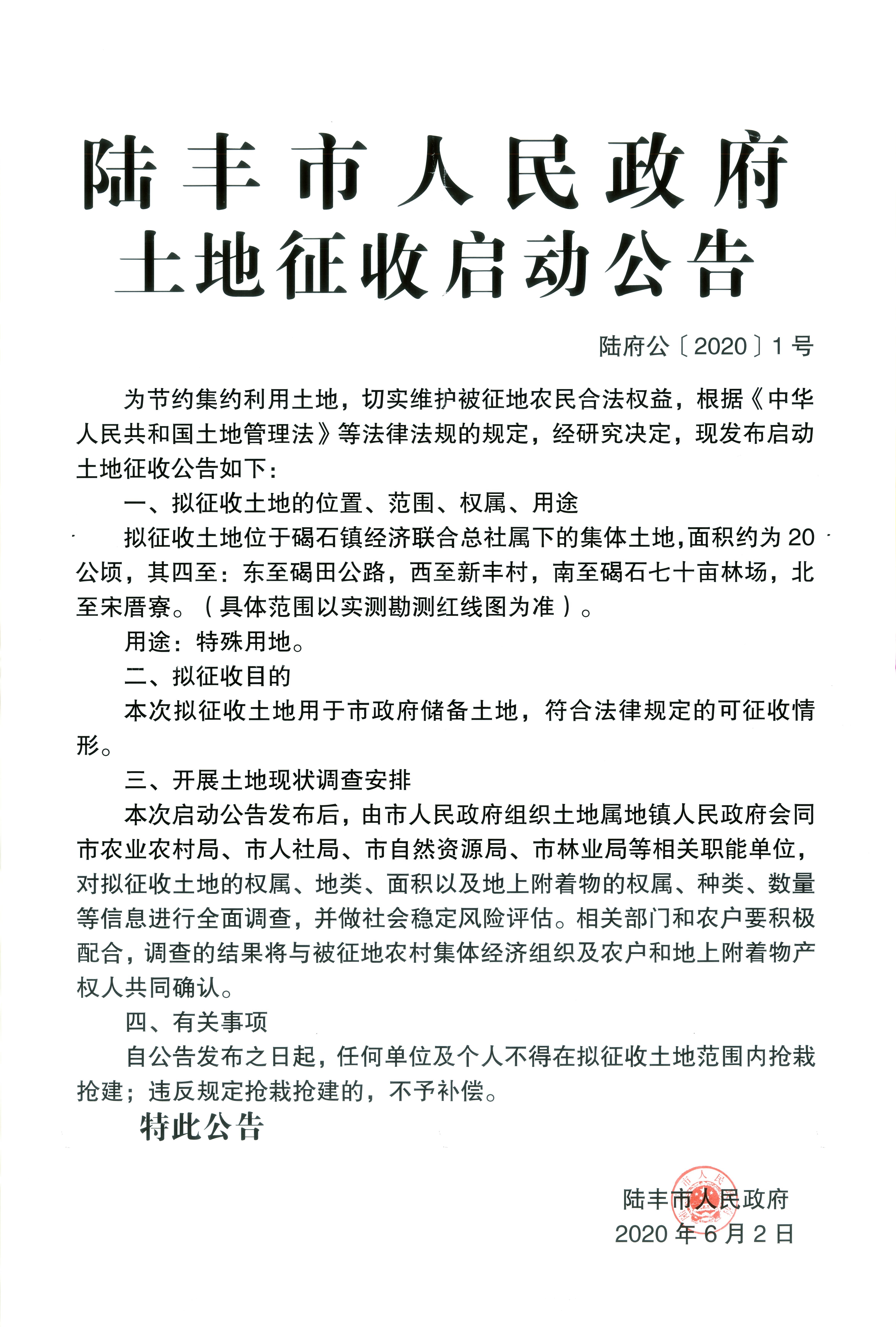 苹果直播 土地征收启动公告(陆府公(2020)1号)