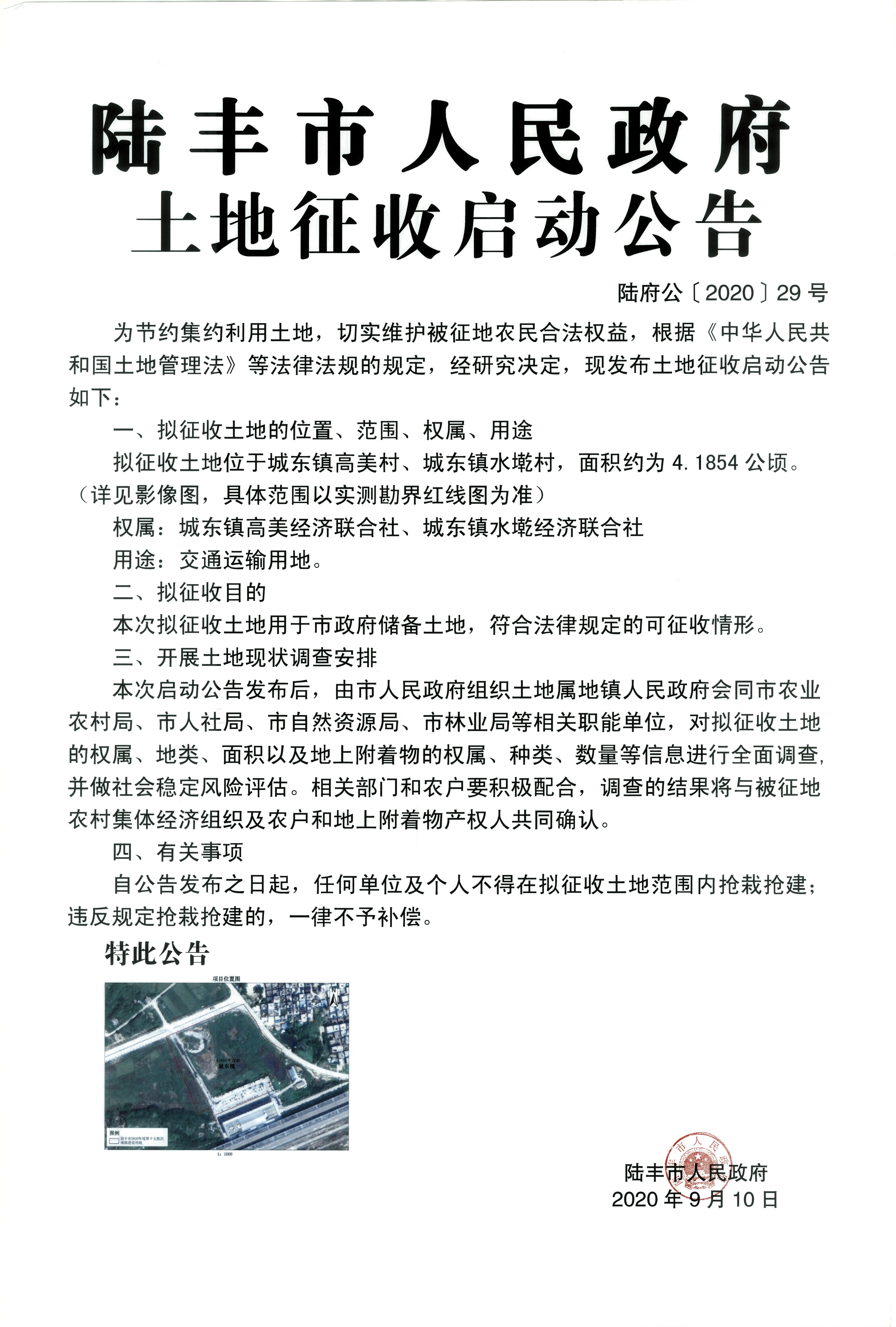 苹果直播 土地征收启动公告 陆府公(2020)29号