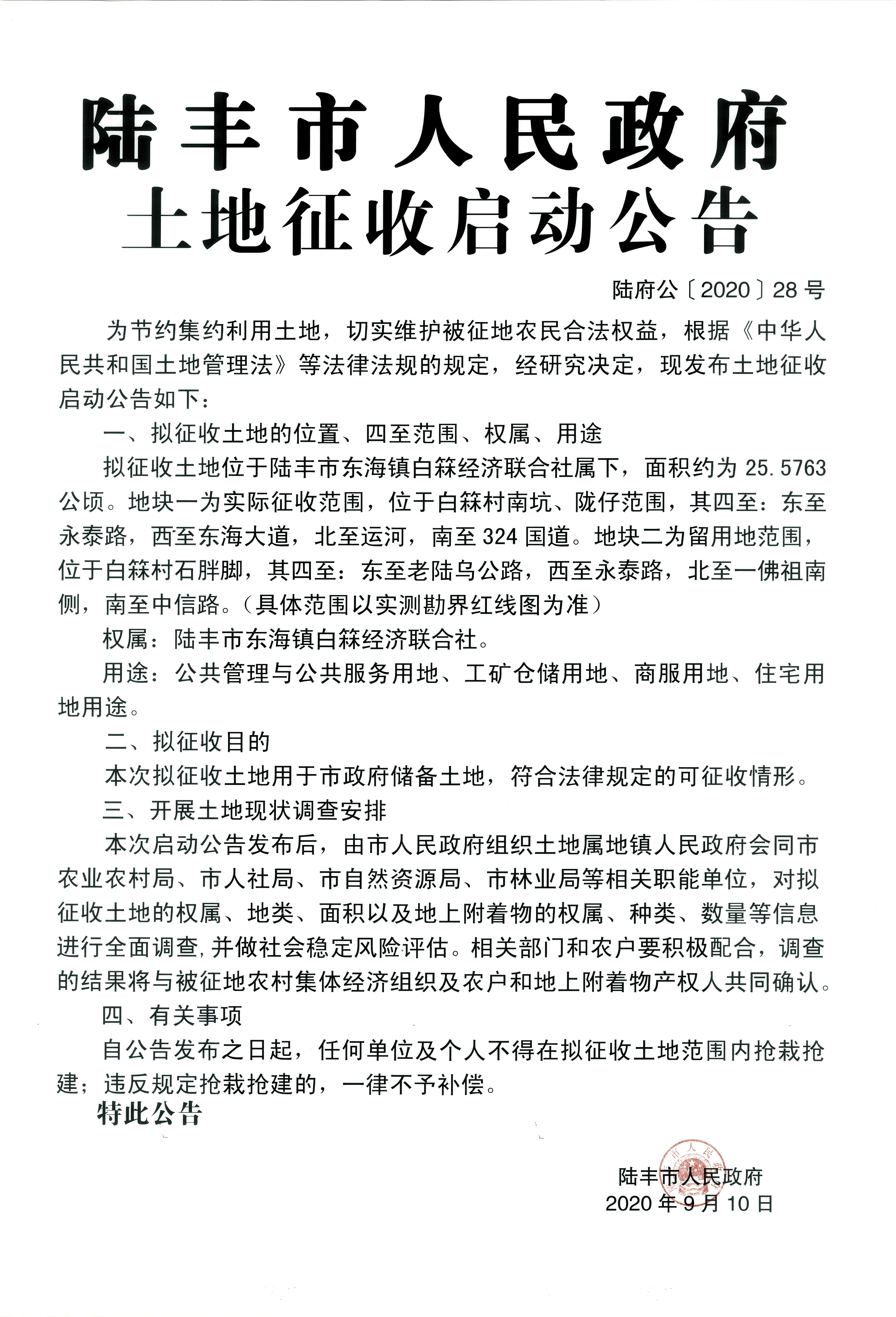 苹果直播 土地征收启动公告-陆府公(2020)28号