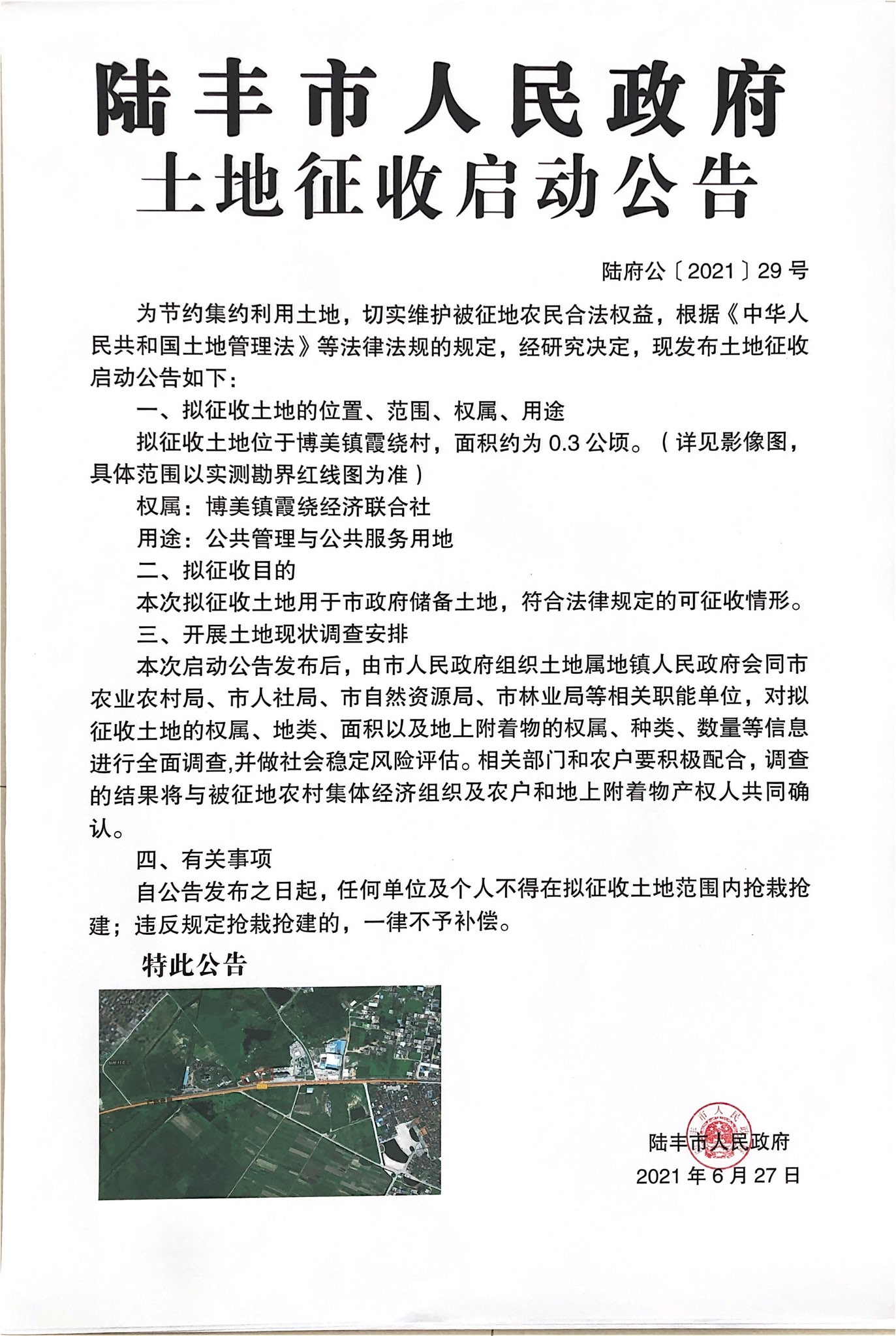 苹果直播 土地征收启动公告-陆府公[2021]29号)