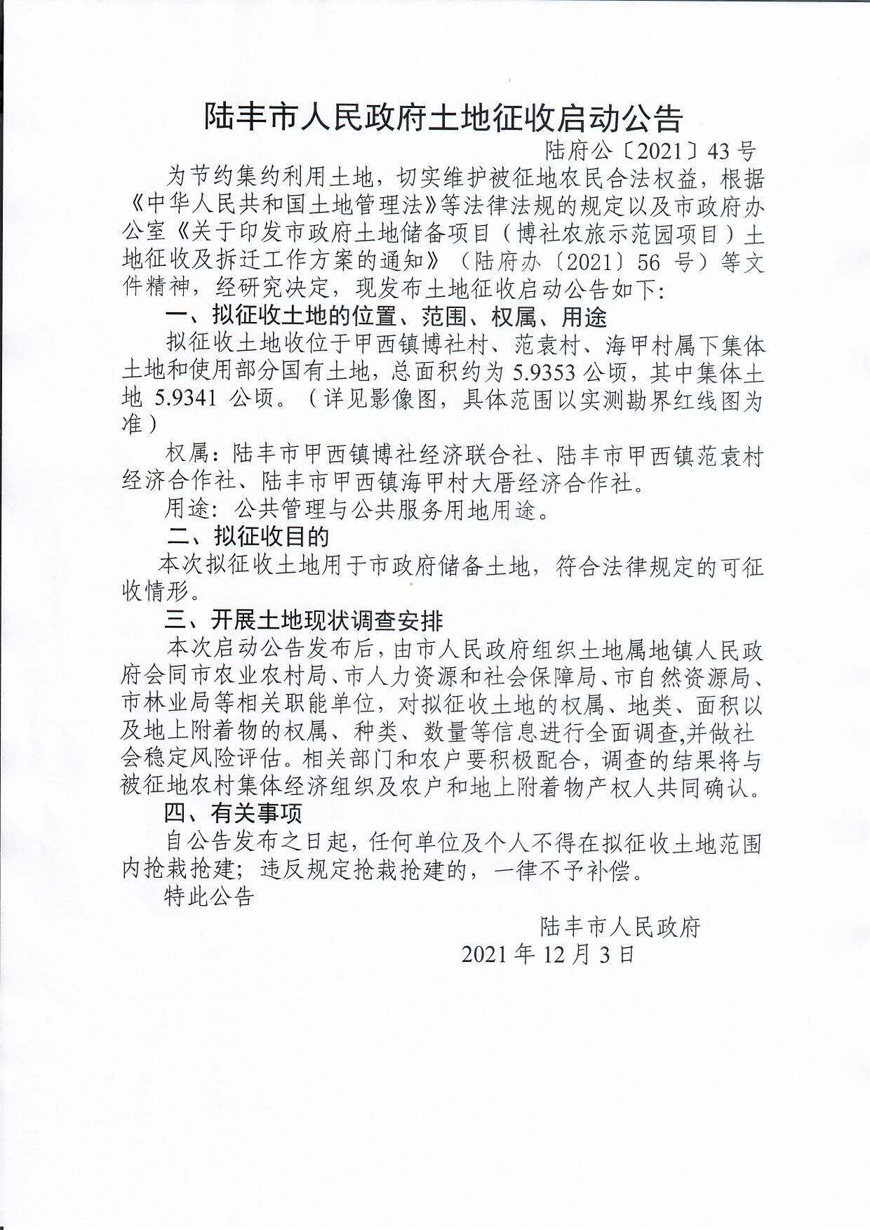 苹果直播 土地征收启动公告(陆府公[2021]43号)