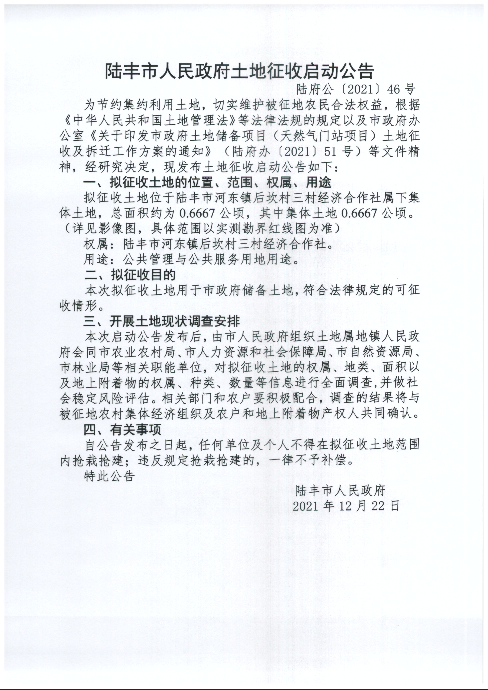 苹果直播 土地征收启动公告(陆府公〔2021〕46号 )