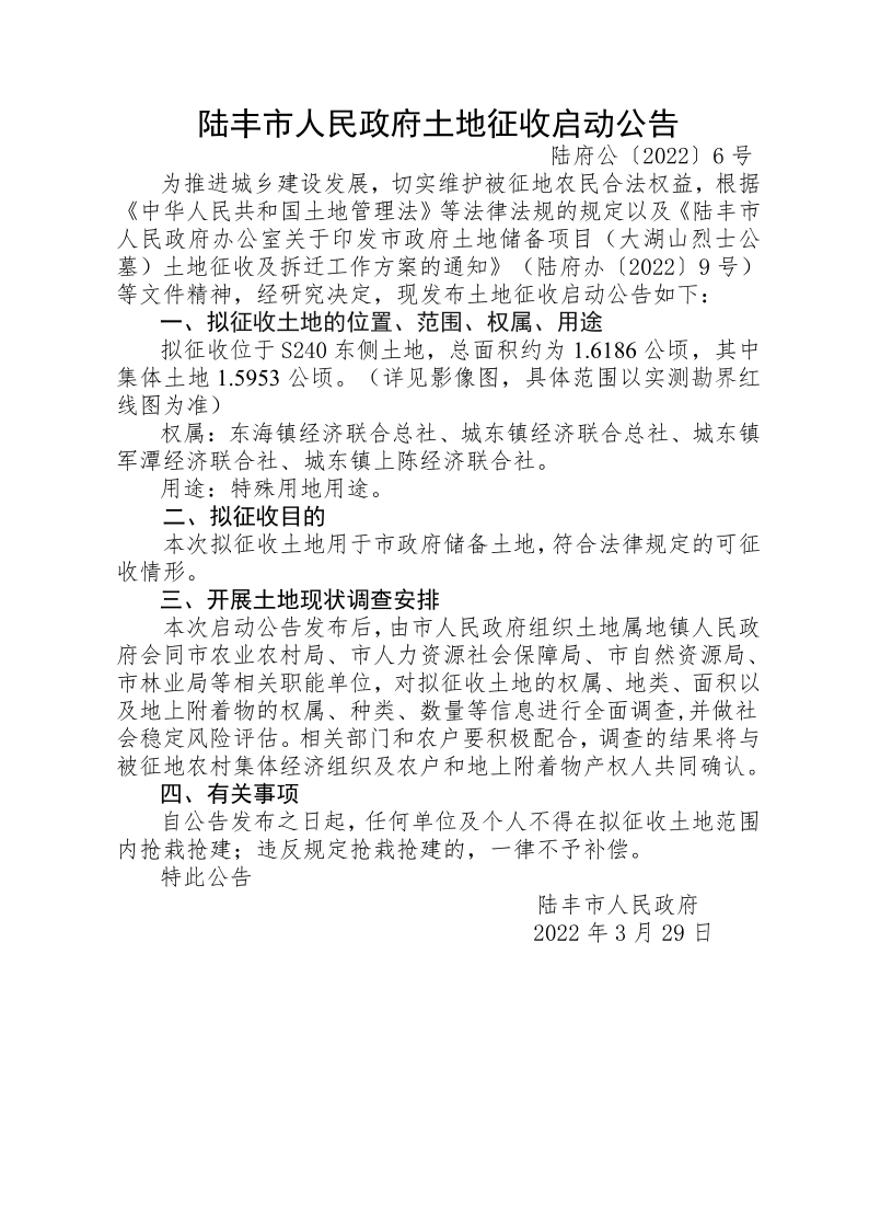 苹果直播 土地征收启动公告(陆府公〔2022〕6 号)