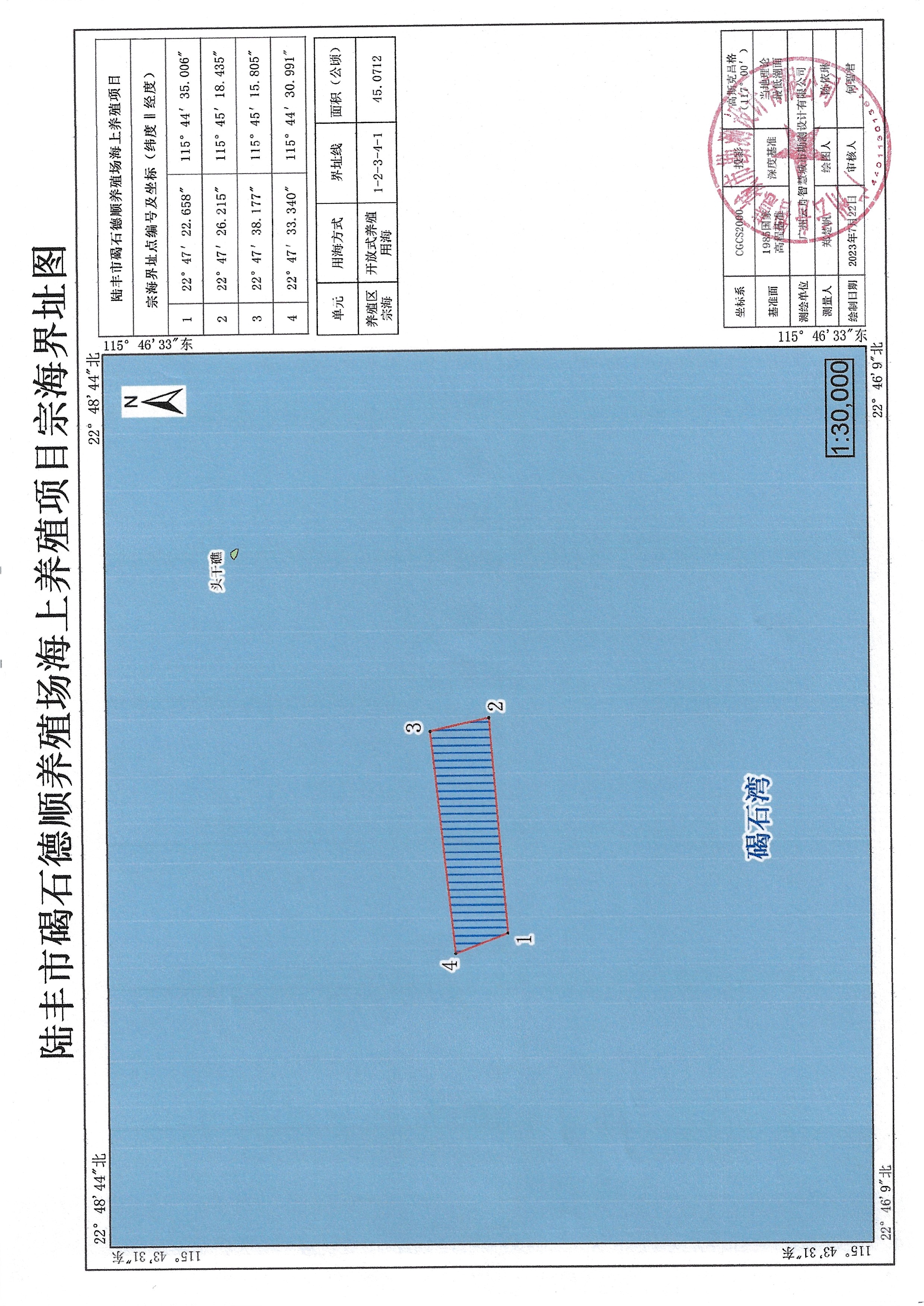 为促进渔业可持续发展,确保依法依规办理水域滩涂养殖证,不损害国家、集体或他人合法权益。根据《中华人民共和国渔业法、水域滩涂养殖发证登记办法》及其他相关法律、法规的规定,经当事人向我局提交办理水域滩涂养殖证的申请,我局已对苹果直播 碣石德顺养殖场进行了现场勘查。苹果直播 碣石德顺养殖场位于碣石湾,碣石港口西南侧约4.6公里处海域,法定代表人为杨南,申请使用面积45.07公顷,详细四至范围为: