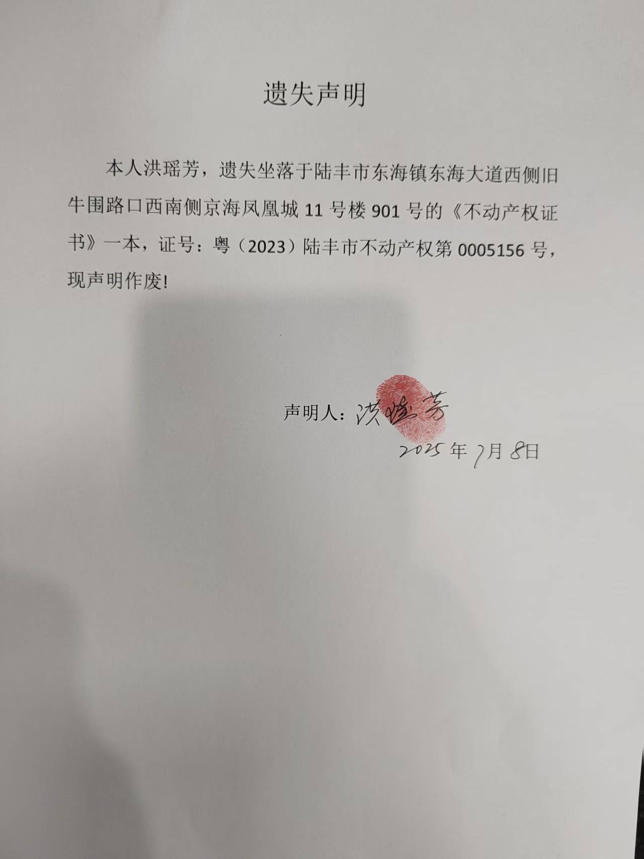 遗失声明:本人洪瑶芳,遗失坐落于苹果直播 东海镇东海大道西侧旧牛围路口西南侧京海凤凰城11号楼901号的《不动产权证书》一本,证号为粤(2023)苹果直播 不动产权第0005156号,现声明作废!