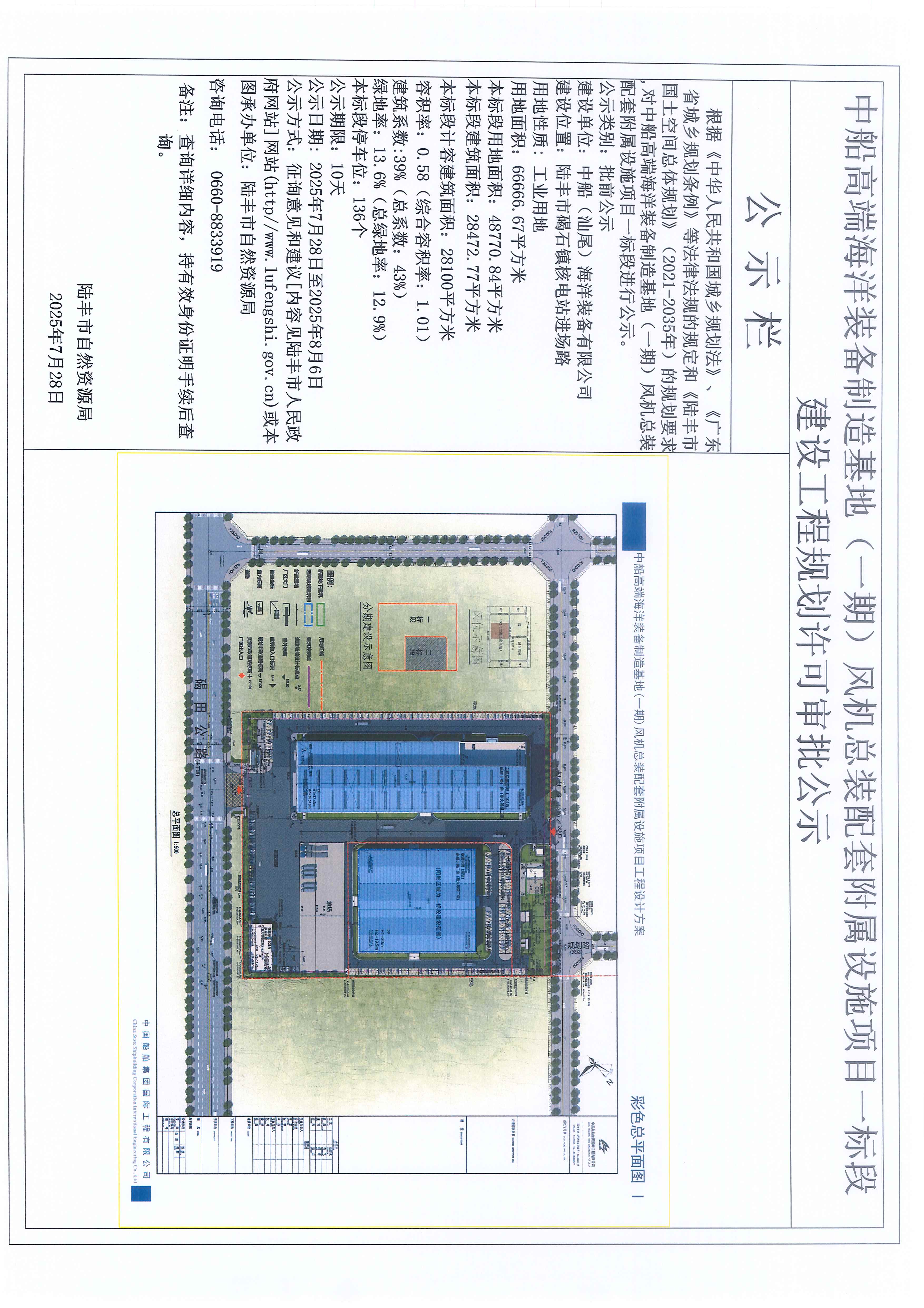 中船高端海洋装备制造基地(一期)风机总装配套附属设施项目一标段建设工程规划许可审批公示