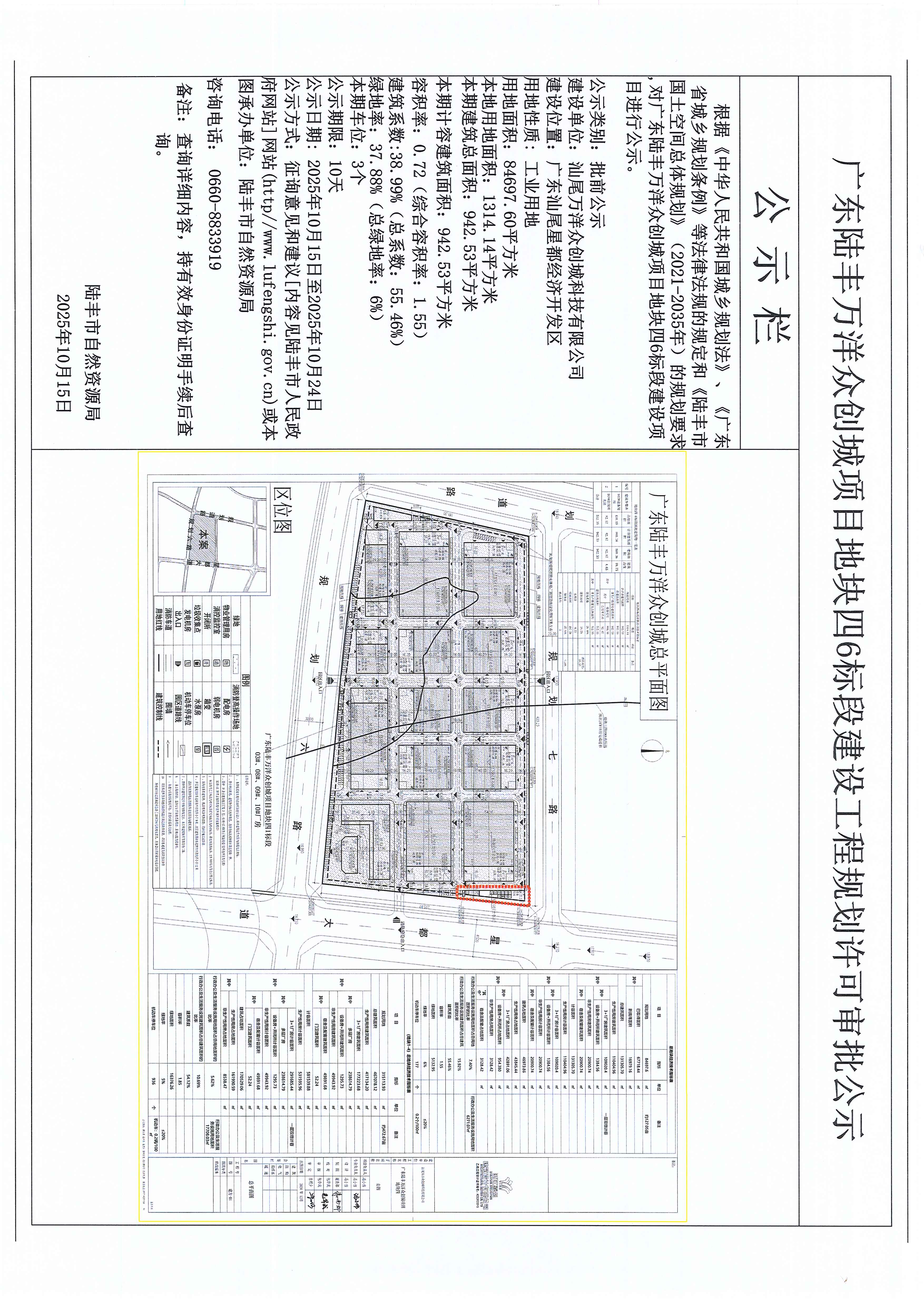 广东陆丰万洋众创城项目地块四6标段建设工程规划许可审批公示