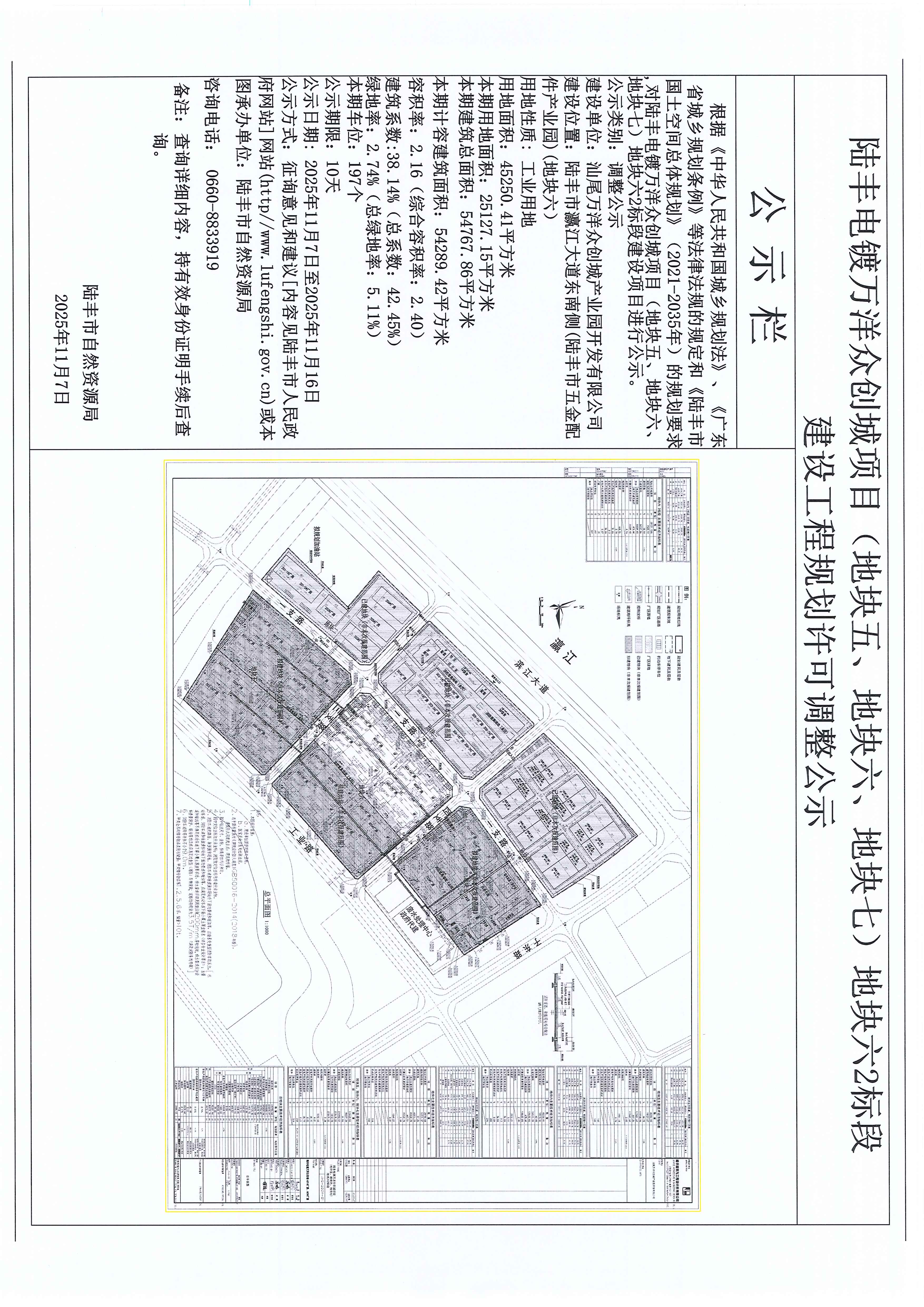 陆丰电镀万洋众创城项目(地块五、地块六、地块七)地块六2标段建设工程规划许可调整公示